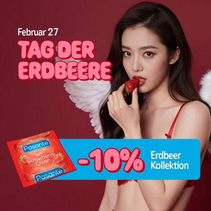 Jetzt kommt der saftige Teil – ein exklusiver Rabatt von 10 % auf unsere Erdbeerkollektion! Kondome und Gleitmittel mit der Essenz sommerlicher Erdbeeren warten auf Sie. Lassen Sie sich dieses köstliche Angebot nicht entgehen – nutzen Sie die Sonne und tauchen Sie ein in den Erdbeerspaß! 🍓💓
